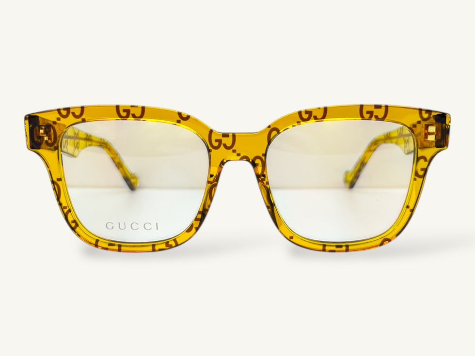Questo modello in celluloide giallo trasparente combina linee squadrate e un carattere deciso, esaltato dalla serigrafia del logo Gucci che percorre elegantemente l’intera montatura.