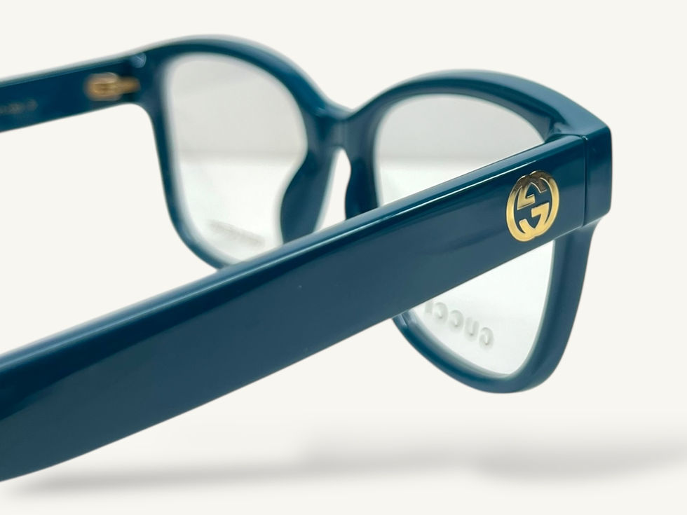 La montatura in acetato, luminosa e profonda nella sua tonalità verde petrolio, avvolge delicatamente il viso, mentre i loghi Gucci in oro sulle aste aggiungono un accento di lusso discreto ma inconfondibile.