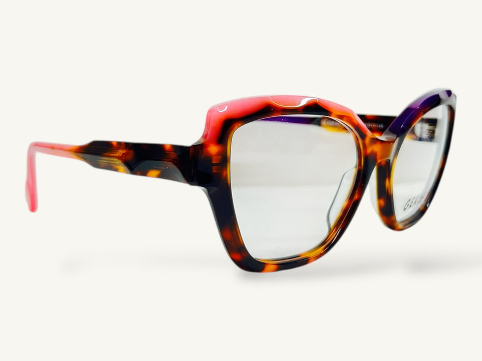 Questo modello si distingue per la sua montatura tartarugata a forma di occhio di gatto, arricchita da delicati dettagli rosa e viola, che donano luce, stile e un tocco giocoso ma sofisticato.