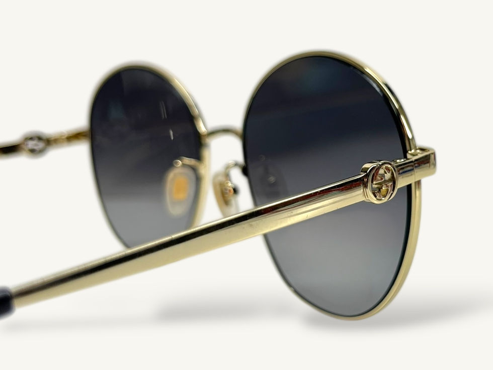 La montatura tonda e sottile valorizza ogni volto con un look sofisticato e discreto, mentre le aste con il logo GG confermano l’esclusività del brand.